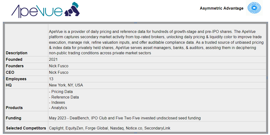 As funding rounds are infrequent, Fusco explained that ApeVue collects pricing data from transactional brokers who are active in institutional-sized deals in the pre-IPO share market.