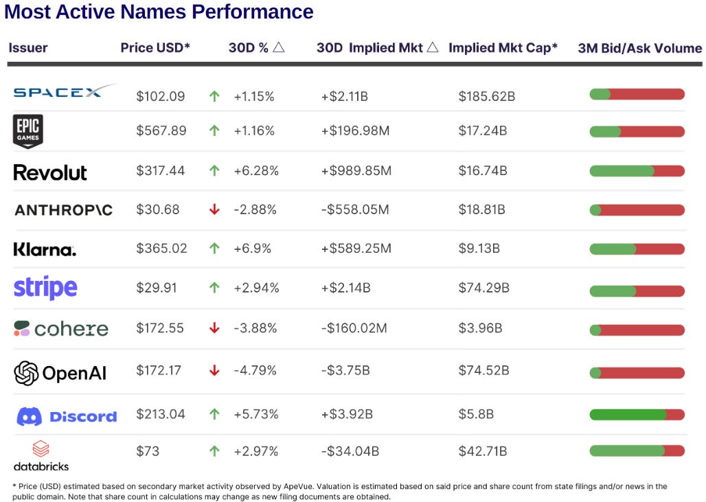 Here, for example, is ApeVue’s data on the most liquid private companies across these platforms: