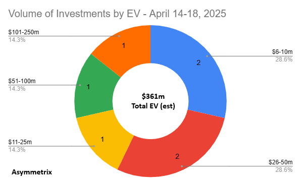 It was a relatively low key week otherwise, with 5 disclosed acquisitions, with a total estimated EV of $154m, and 7 investments announced, with a total estimated EV of $361m.