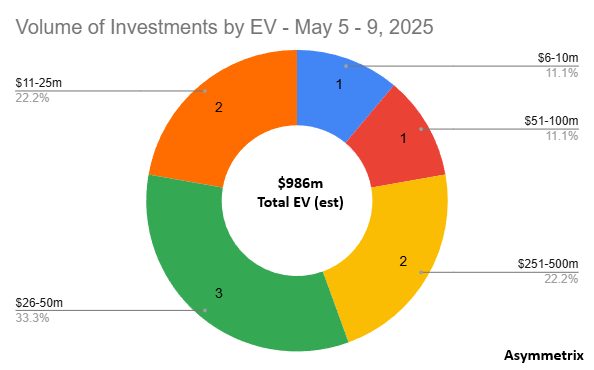 9 investments were announced, with a total estimated EV of $986m.