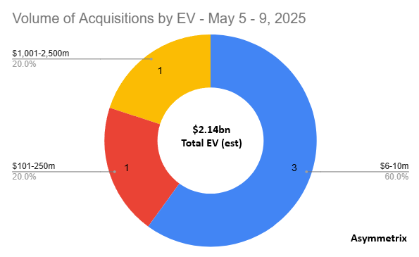 In all, last week Asymmetrix tracked 5 disclosed acquisitions, with a total estimated EV of $2.14bn, and 9 investments, with a total estimated EV of $986m.